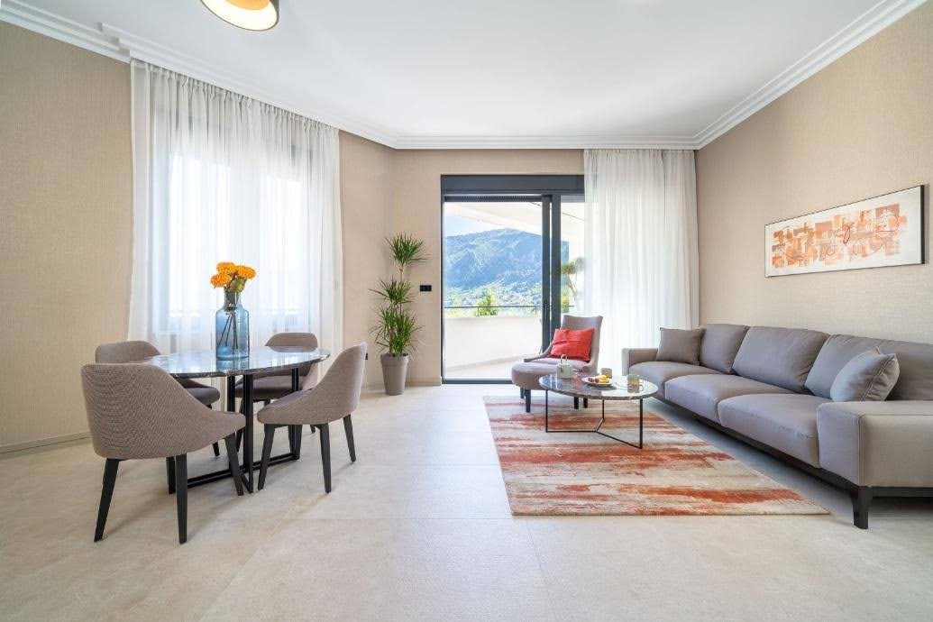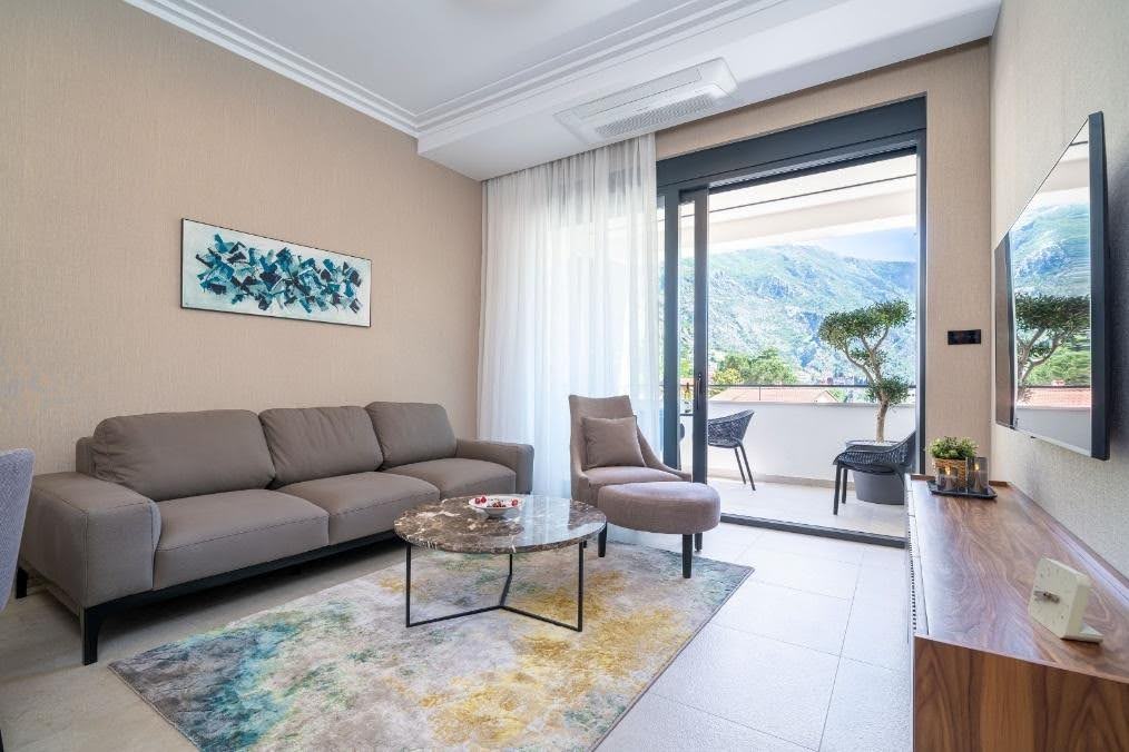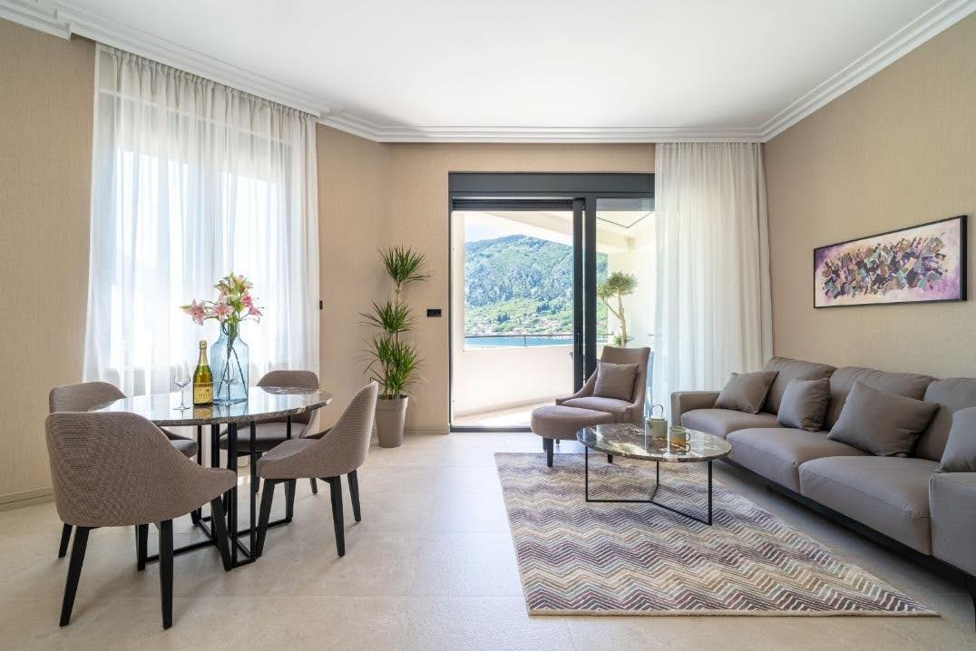 Selected apartments feature private balconies or terraces with open views of Kotor Bay and the surrounding mountains.
